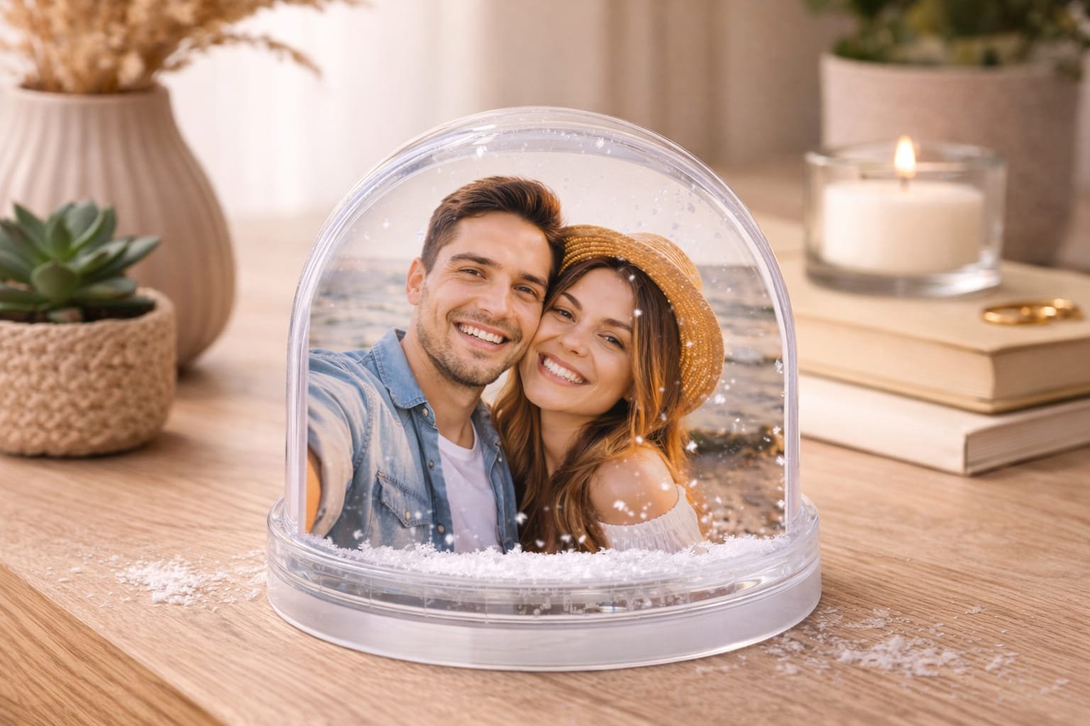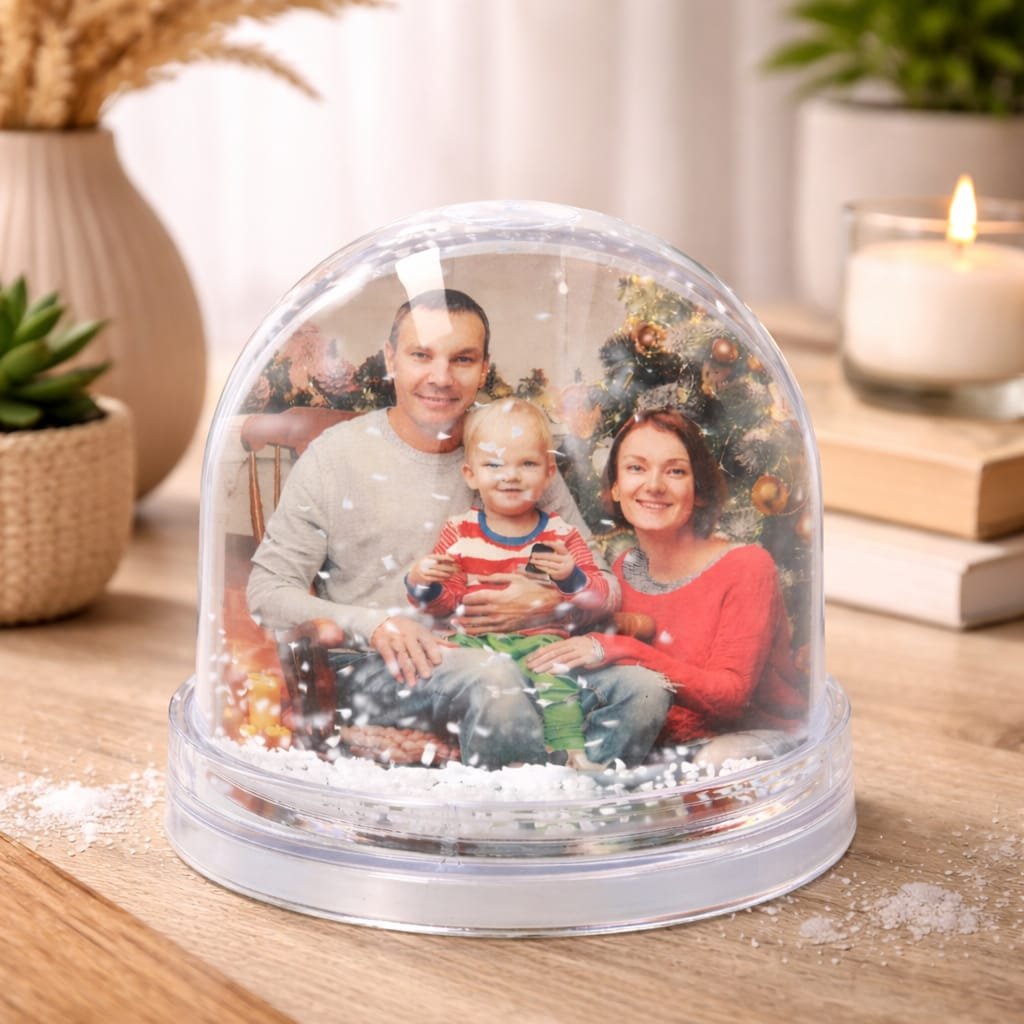 - Photo globes con forma de cúpula y base redonda con copos de nieve