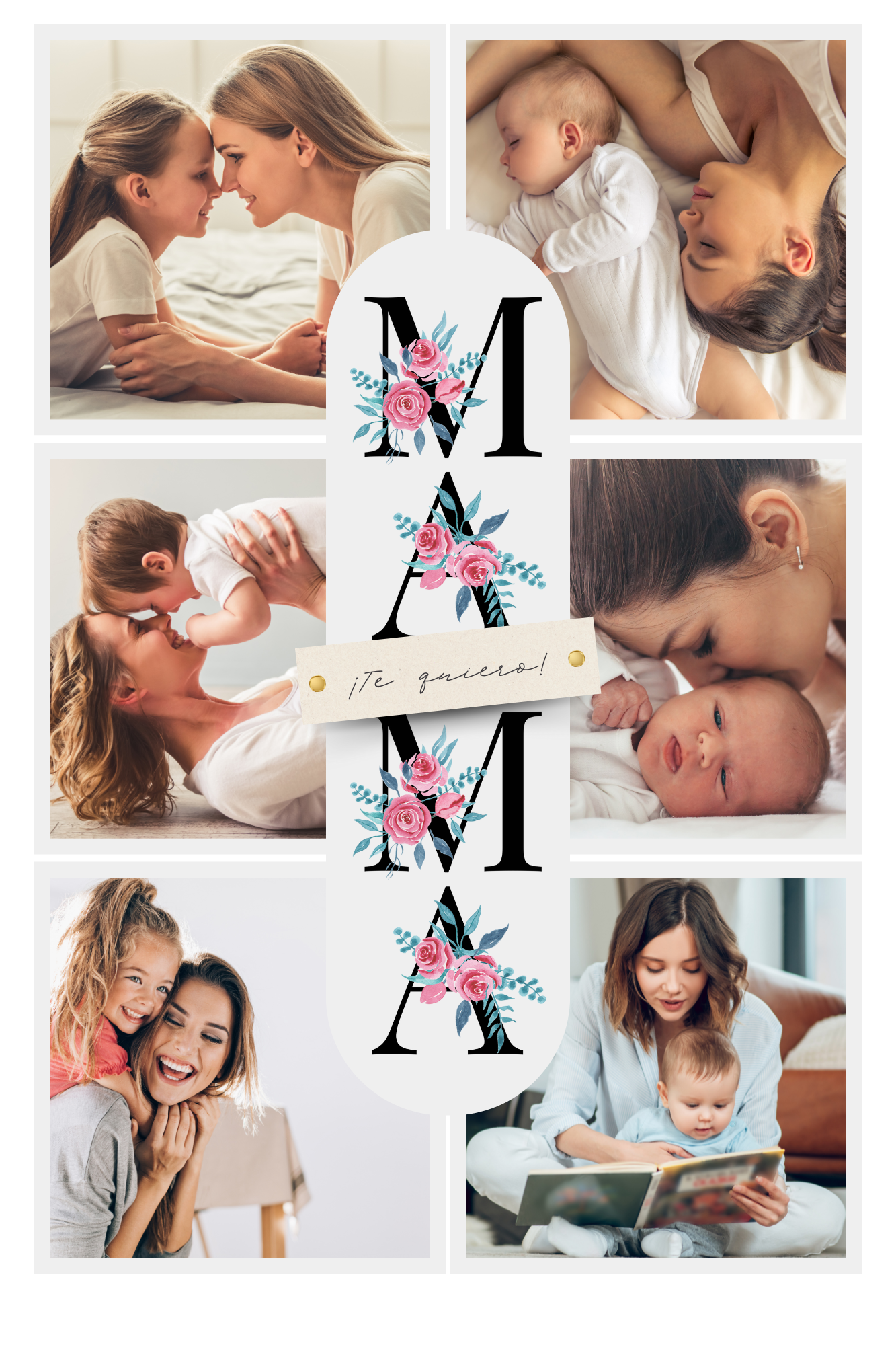 El diseño incluye varias fotos, decoración floral y un mensaje especial (ej: “¡Te quiero!”), creando un recuerdo lleno de amor y familia.