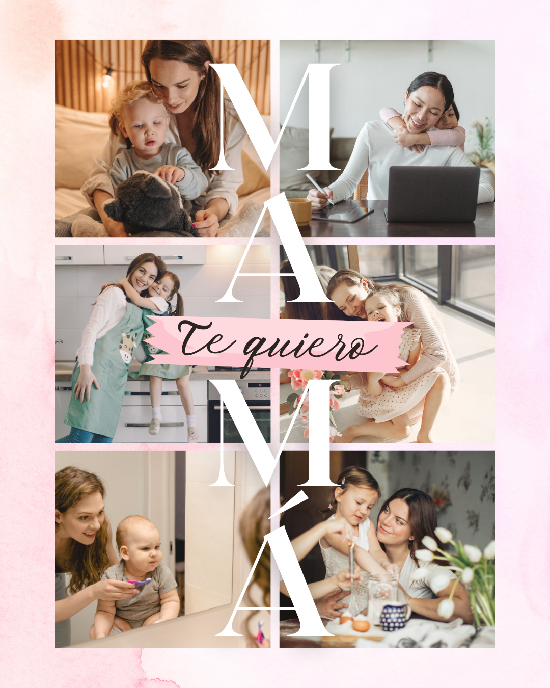 Esta lámina personalizada con collage fotográfico combina un diseño suave en tonos rosados con la palabra MAMÁ en grande, creando un recuerdo emotivo, elegante y moderno.