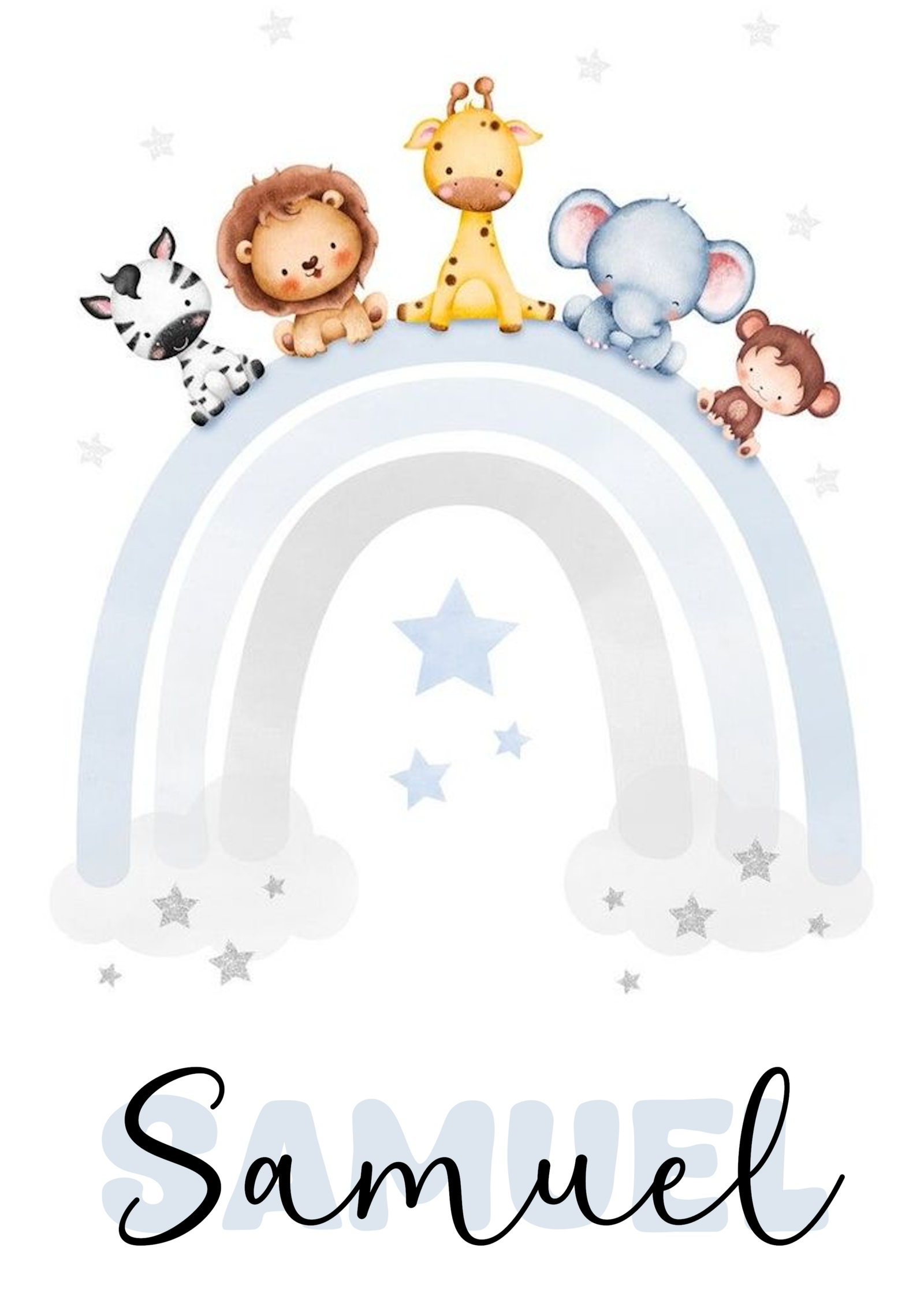 Dulce y encantadora lámina infantil con un suave arcoíris en tonos pastel acompañada de adorables animales: cebra, león, jirafa, elefante y monito. Un diseño tierno y armonioso que transmite calma, alegría y ternura, ideal para decorar habitaciones de bebé y niños. Personalizable con el nombre, se convierte en un detalle único y especial, perfecto como regalo de nacimiento, bautizo o cumpleaños. Aporta un toque mágico, delicado y lleno de amor a cualquier espacio infantil.