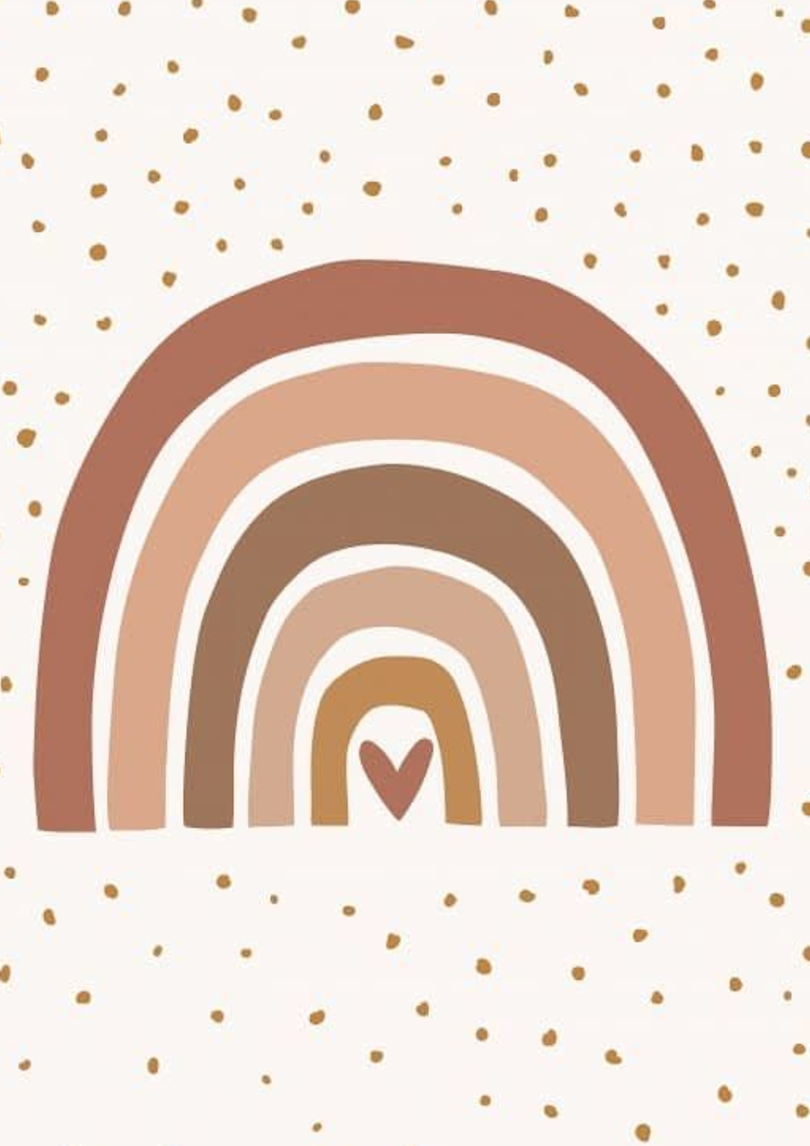 Preciosa lámina infantil con un elegante arcoíris en tonos tierra y cálidos matices naturales, acompañada de pequeños detalles delicados y un sutil corazón central. Un diseño dulce, minimalista y armonioso que transmite calma, ternura y serenidad, ideal para decorar habitaciones de bebé y niños. Perfecto como regalo de nacimiento, bautizo o cumpleaños. Añade un toque acogedor, moderno y lleno de amor a cualquier espacio infantil.