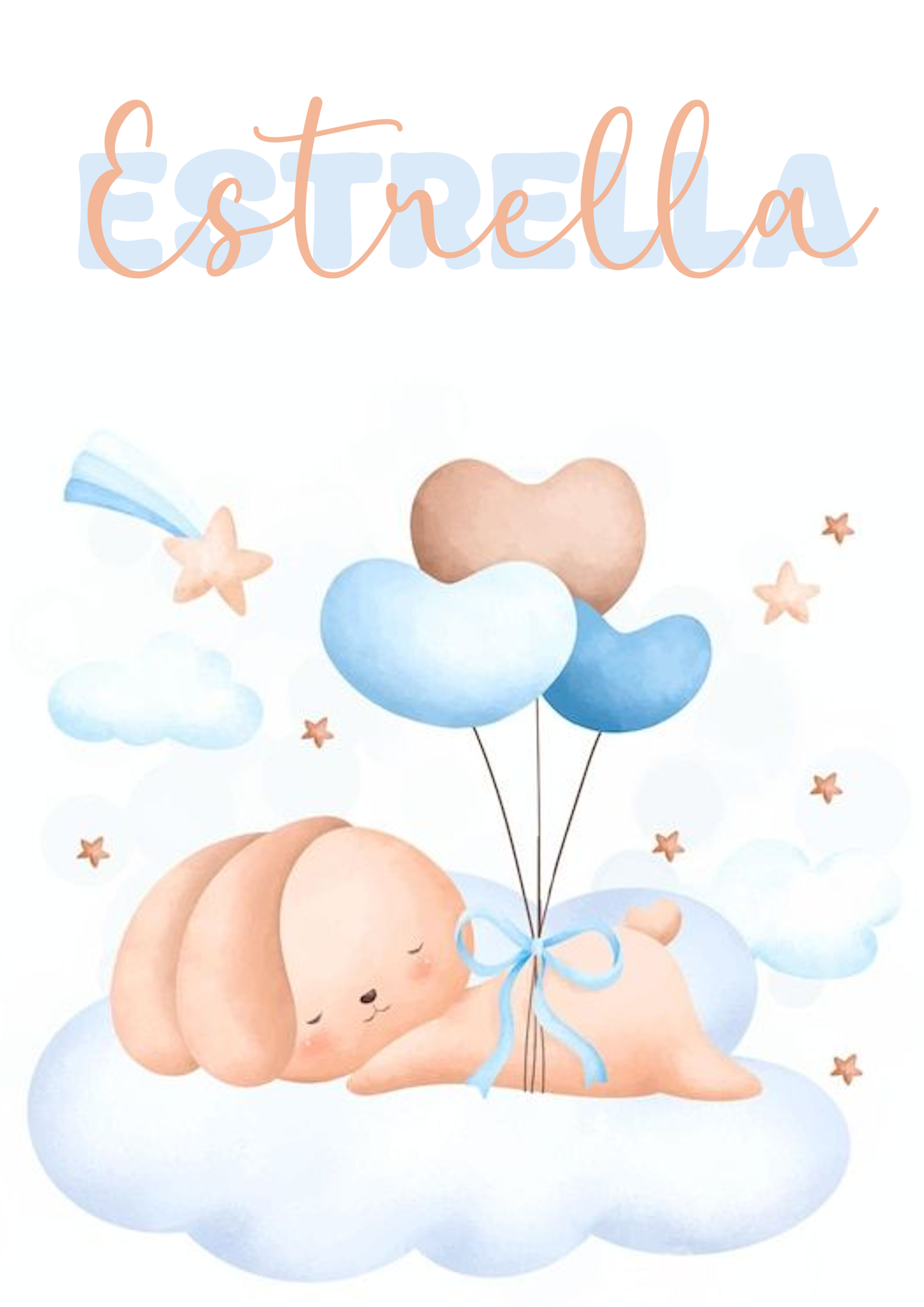 Delicada lámina infantil personalizada con el nombre Estrella, protagonizada por un dulce conejito que duerme plácidamente sobre una suave nube, sujetando globos en forma de corazón. Rodeado de pequeñas estrellas y nubes, el diseño transmite calma, ternura y un ambiente soñador.