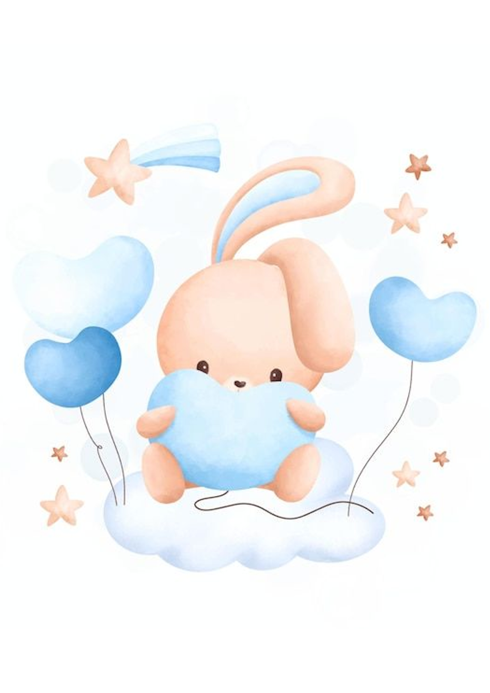 Tierna lámina infantil protagonizada por un adorable conejito sentado sobre una suave nube, abrazando un dulce corazón azul. Rodeado de pequeños globos en forma de corazón y delicadas estrellitas, este diseño transmite ternura, calma y un ambiente mágico perfecto para los más pequeños.