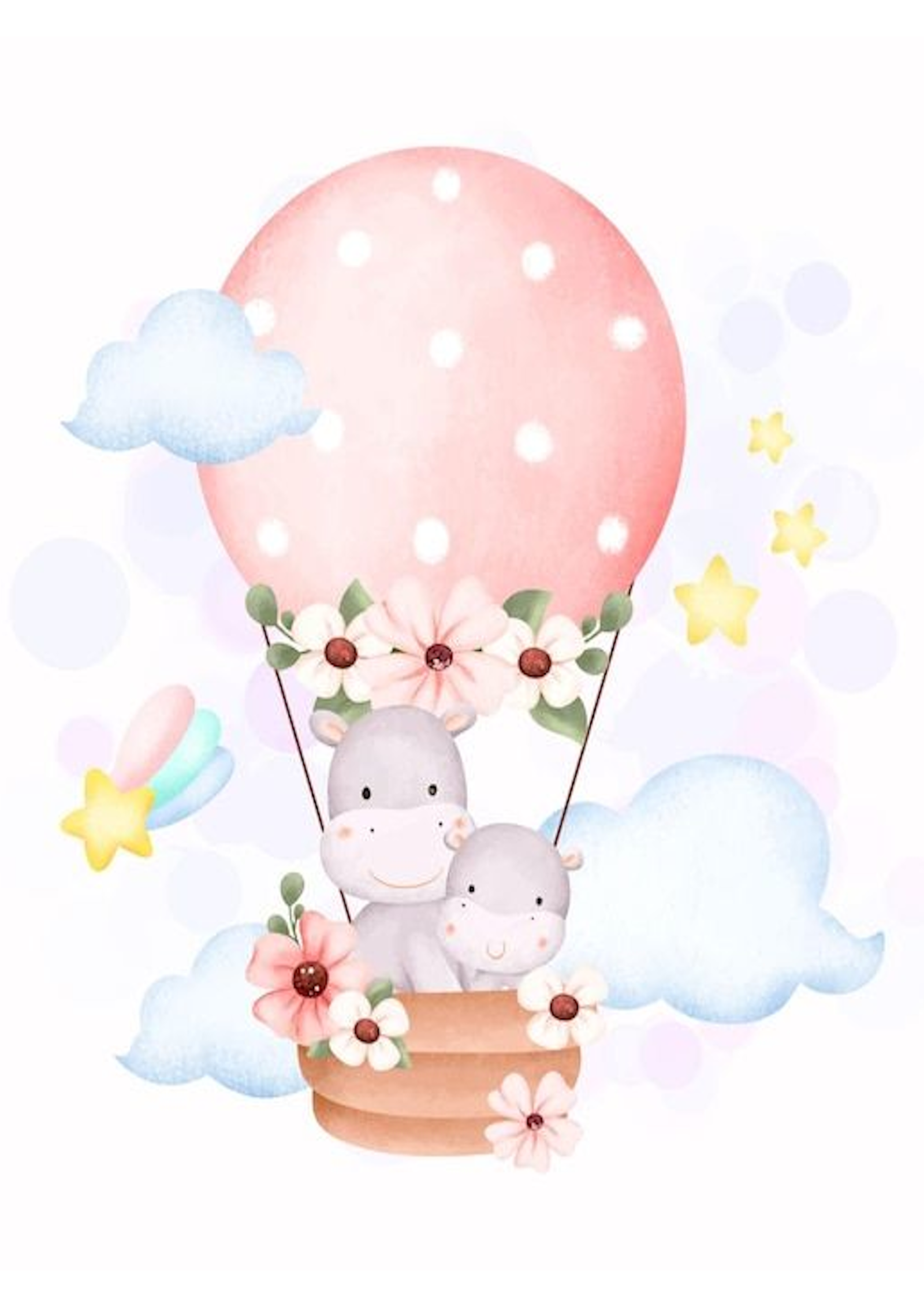 Dulce y encantadora lámina infantil con dos adorables hipopótamos viajando en un bonito globo aerostático decorado con flores, rodeados de suaves nubes y pequeñas estrellas brillantes. La ilustración transmite ternura, calma y un toque mágico, perfecta para crear un ambiente acogedor y soñador en la habitación infantil.