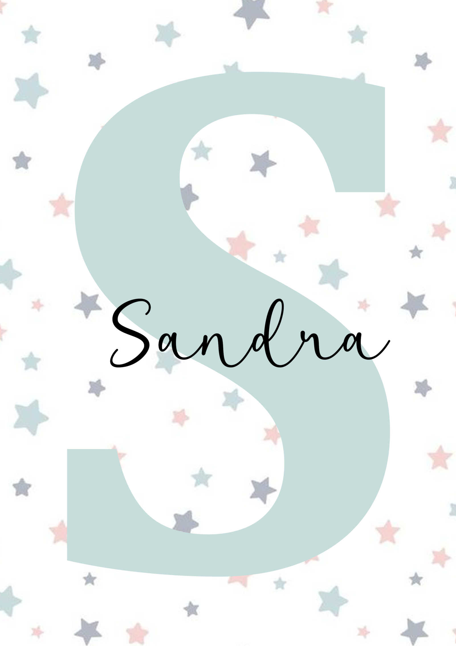 Encantadora lámina infantil personalizada con la inicial en gran tamaño en un suave tono verde agua, acompañada de un delicado fondo de pequeñas estrellas en colores pastel. El nombre aparece en una elegante tipografía manuscrita que aporta dulzura y personalidad al diseño. Ideal para decorar habitaciones infantiles y de bebé, creando un ambiente tierno, tranquilo y acogedor. Perfecta como regalo de nacimiento, bautizo, cumpleaños o para añadir un toque único y especial a la habitación de los más pequeños.