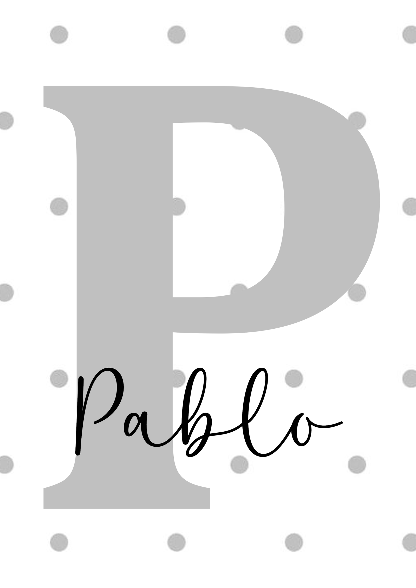 Elegante lámina infantil personalizada con la inicial en gran tamaño en tono gris suave sobre un fondo decorado con delicados puntos. El nombre aparece en una bonita tipografía manuscrita, creando un diseño limpio, moderno y atemporal. Perfecta para decorar habitaciones infantiles y de bebé, aportando un estilo dulce y armonioso. Ideal como regalo de nacimiento, bautizo, cumpleaños o para añadir un toque personal y especial a cualquier espacio infantil.