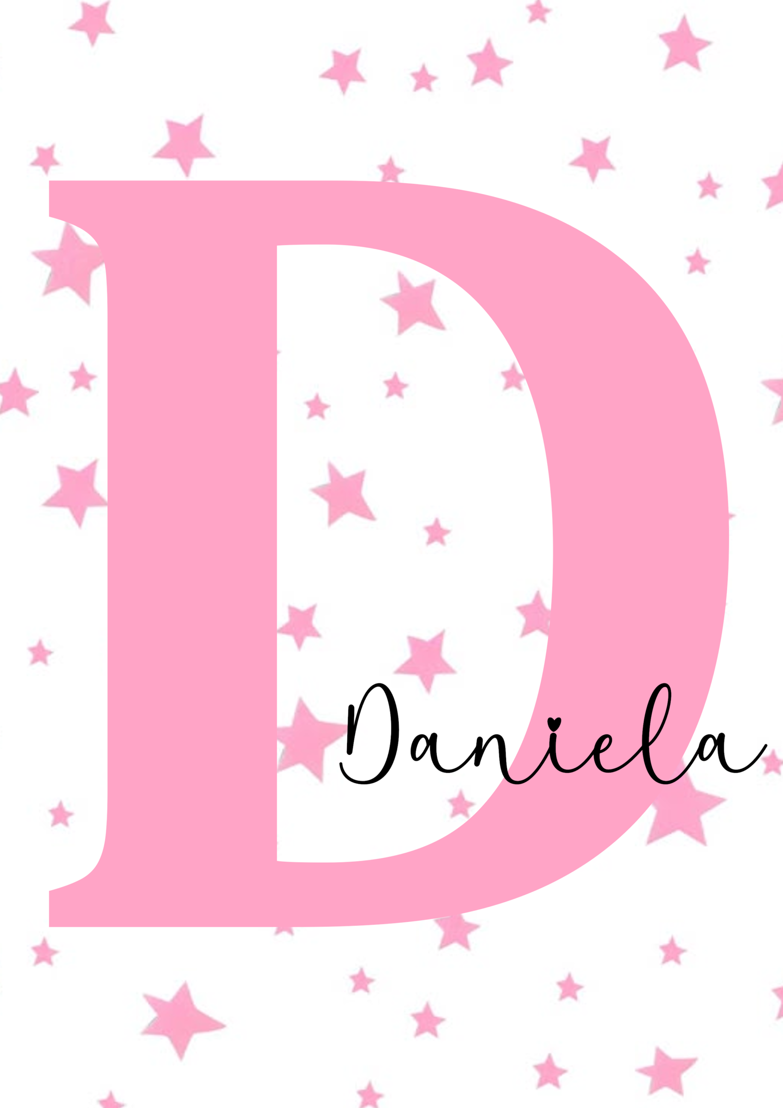 Delicada lámina infantil con la inicial en gran tamaño en un bonito tono rosa suave y el nombre en elegante tipografía manuscrita, sobre un fondo decorado con pequeñas estrellas rosas. Su diseño dulce y armonioso aporta un ambiente tierno, cálido y acogedor, ideal para habitaciones de bebé o infantil. Personalizable con el nombre, es un regalo único y especial para nacimientos, bautizos o cumpleaños. Un diseño encantador que combina fácilmente con decoraciones suaves y románticas, añadiendo un toque mágico al espacio de tu peque.