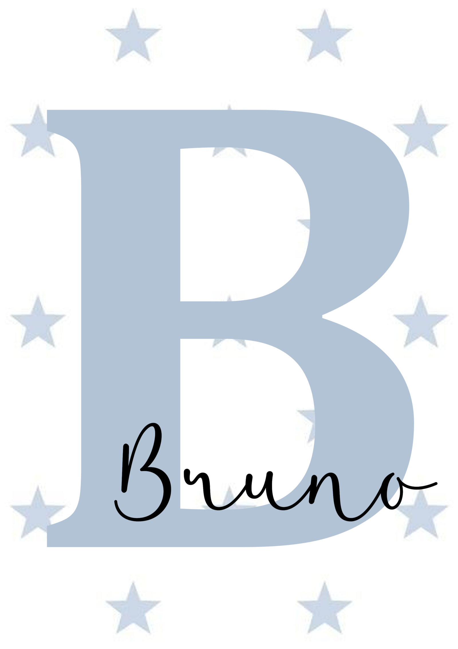 Delicada lámina infantil con la inicial en gran formato en tono azul suave y el nombre en tipografía manuscrita, sobre un fondo decorado con pequeñas estrellas. Su diseño dulce y relajante aporta un ambiente tranquilo y acogedor, ideal para decorar habitaciones de bebé o infantil. Personalizable con el nombre, es un detalle único perfecto para regalar en nacimientos, bautizos o cumpleaños. Un diseño atemporal que combina fácilmente con cualquier estilo decorativo y añade un toque tierno y especial al espacio de tu peque.
