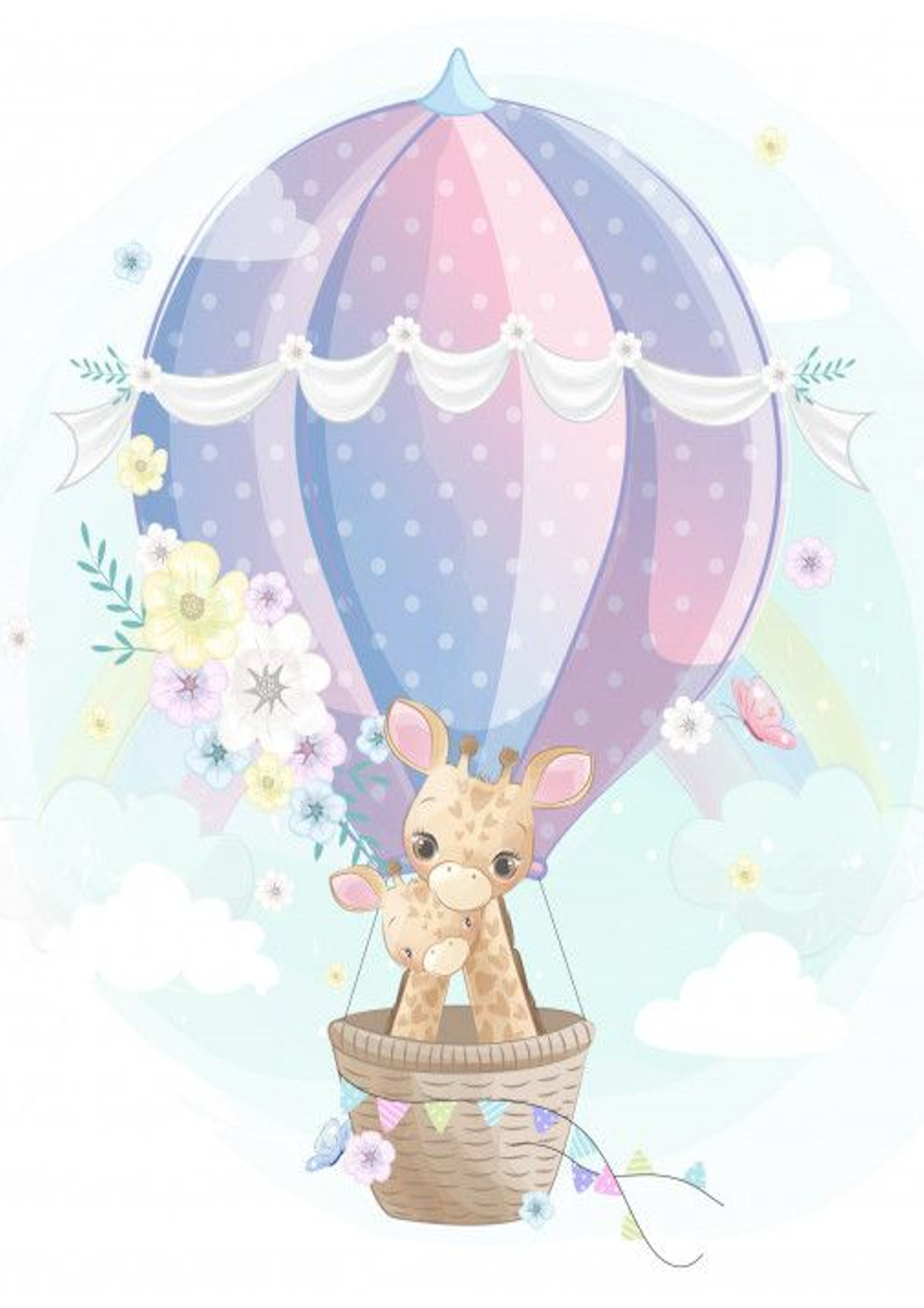 Encantadora lámina infantil protagonizada por una dulce jirafa y su bebé viajando en un precioso globo aerostático, rodeadas de flores, nubes suaves y un delicado arcoíris de fondo. La ilustración transmite ternura, amor y un ambiente mágico, perfecta para crear un espacio acogedor y lleno de dulzura en la habitación infantil.