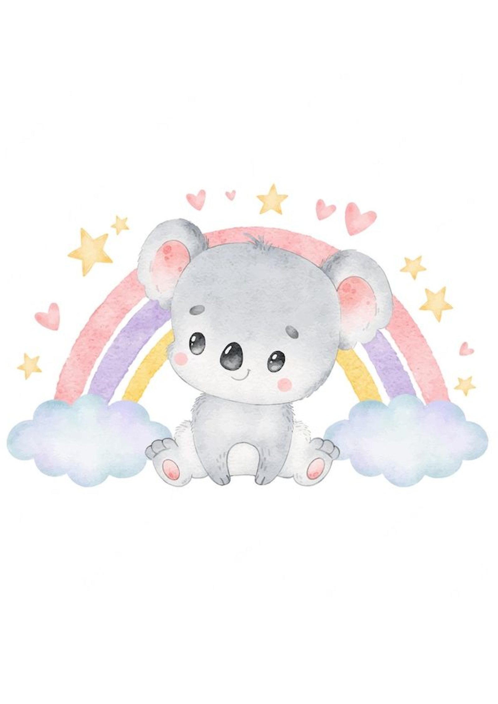 Dulce y encantadora lámina infantil con un adorable koala sentado sobre suaves nubes, acompañado de un bonito arcoíris en tonos pastel, estrellas y pequeños corazones. Un diseño tierno y armonioso que transmite calma, ternura y dulzura, ideal para decorar habitaciones de bebé y niños. Perfecto como regalo de nacimiento, bautizo o cumpleaños. Añade un toque mágico, suave y lleno de amor a cualquier espacio infantil.