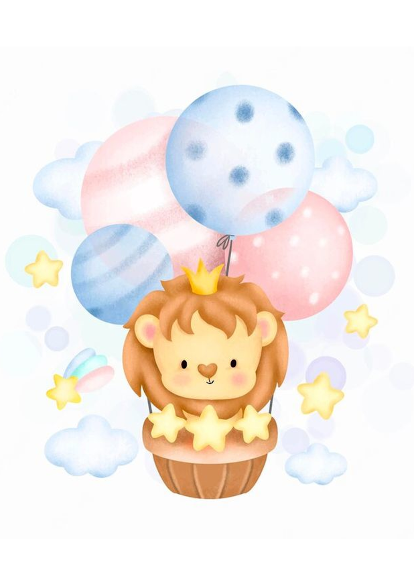 Tierna y luminosa lámina infantil protagonizada por un dulce leoncito con coronita, que viaja feliz sostenido por suaves globos en tonos pastel. Desde su pequeña cestita, el leoncito sonríe rodeado de estrellitas brillantes y nubes suaves, creando una escena mágica y soñadora llena de dulzura.