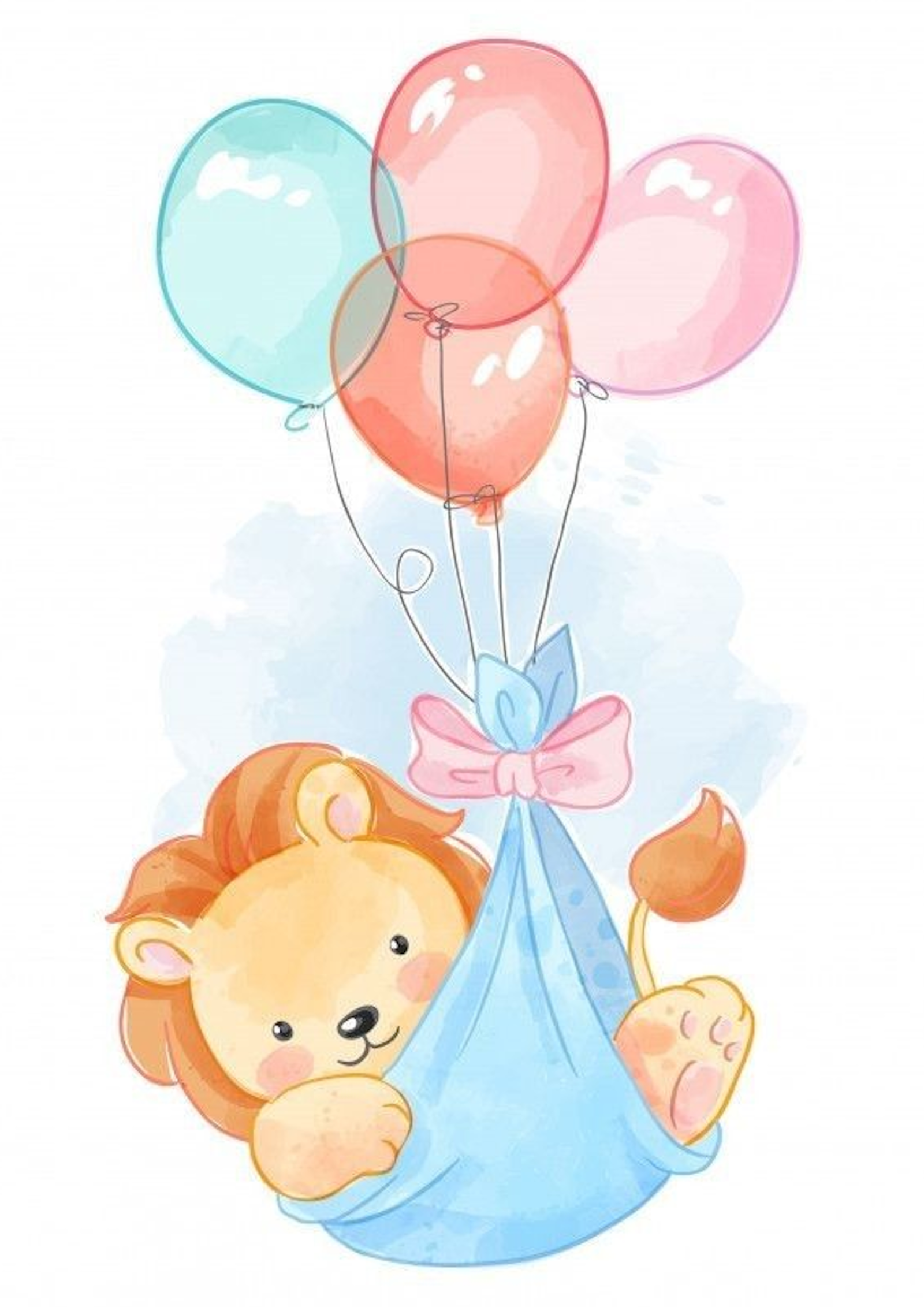 Tierna ilustración de un pequeño leoncito que viaja por el cielo sostenido por un ramillete de globos en suaves tonos pastel. El león, acurrucado en una bolsita azul con un lazo, transmite dulzura, alegría y sensación de aventura, mientras flota entre nubes suaves y colores delicados.