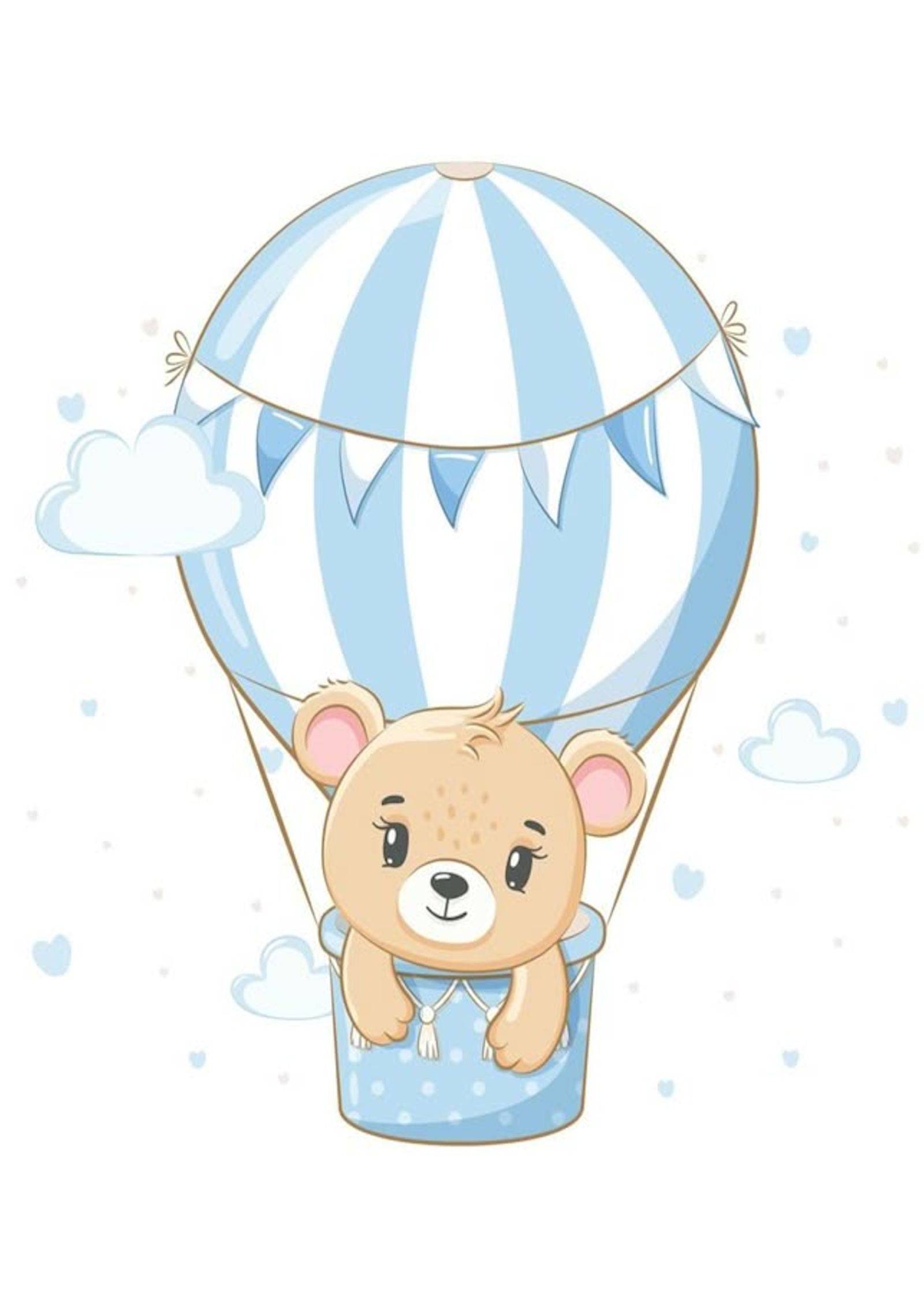 Dulce ilustración de un tierno osito viajando en un encantador globo aerostático de rayas azules y blancas. Rodeado de suaves nubes y pequeños corazones, el diseño transmite calma, ternura y una sensación de aventura soñadora en el cielo.