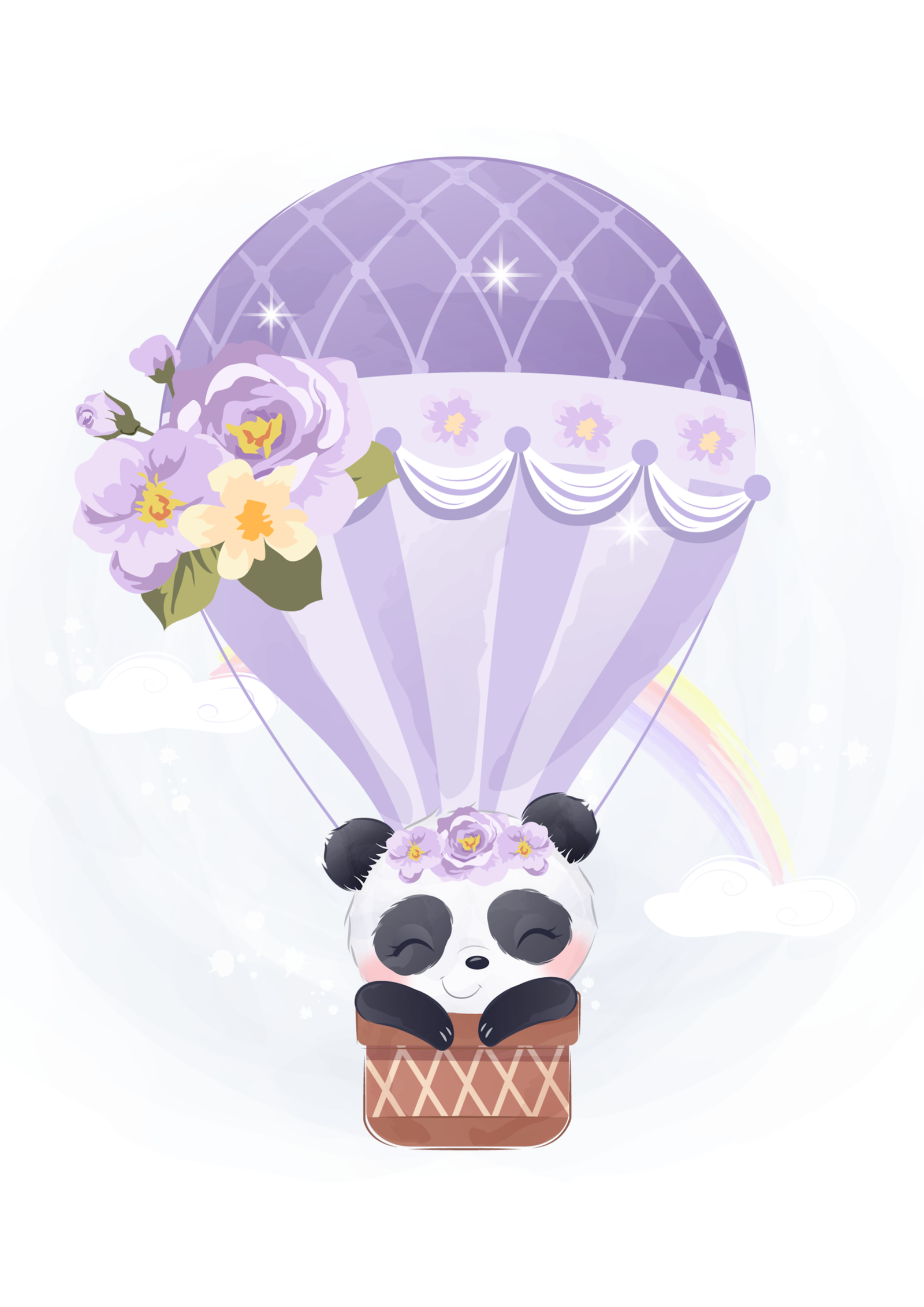 Dulce y delicada lámina infantil protagonizada por un tierno osito panda que viaja plácidamente en su globo aerostático decorado con flores. La escena, rodeada de suaves nubes y un sutil arcoíris, transmite calma, ternura y un toque mágico que invita a soñar.