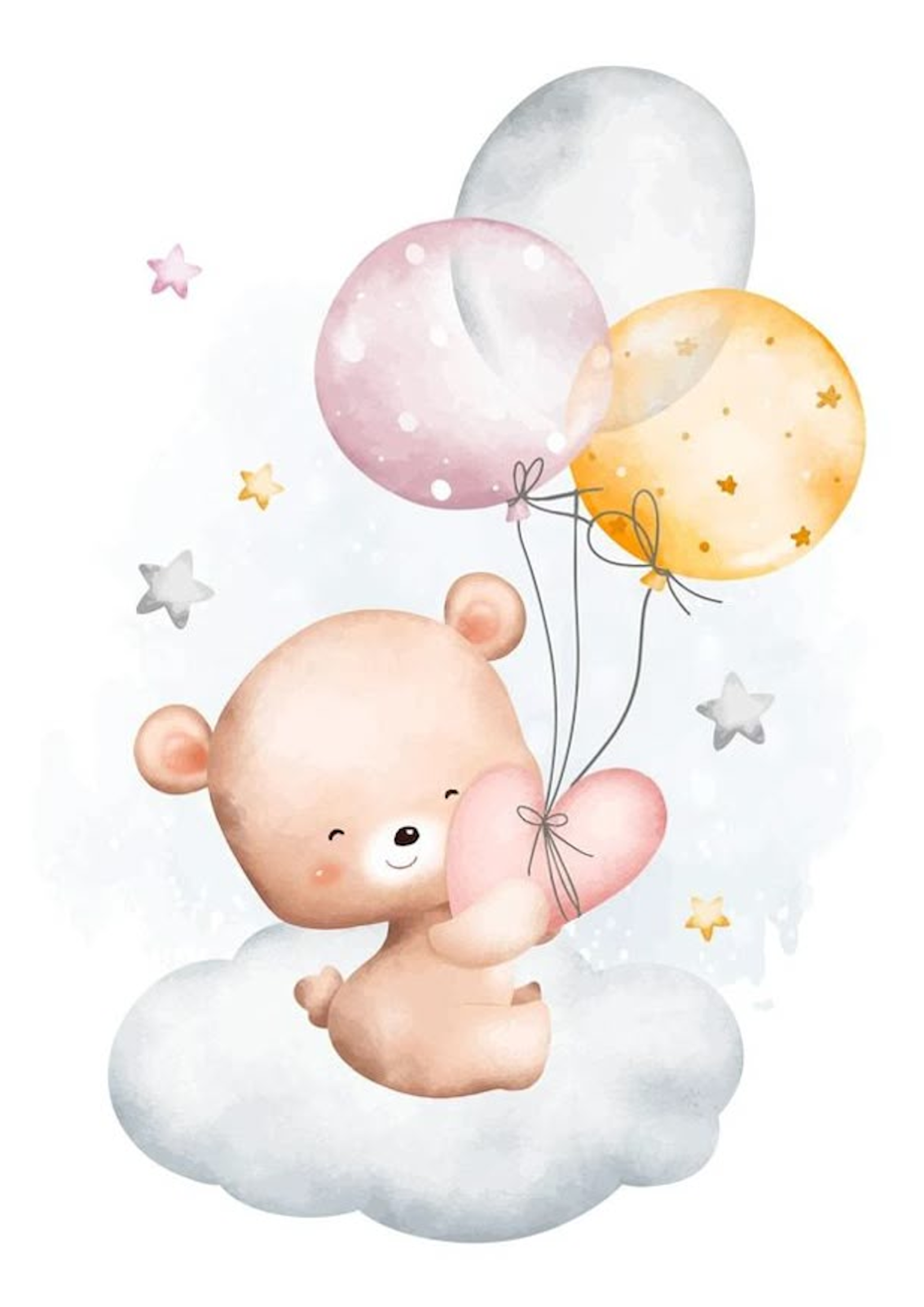 Tierna ilustración de un dulce osito sentado sobre una suave nube, sosteniendo un pequeño corazón mientras vuela acompañado de globos en tonos pastel: rosa, gris y dorado. Las estrellitas alrededor añaden un toque mágico y delicado que transmite amor, ternura y dulzura.