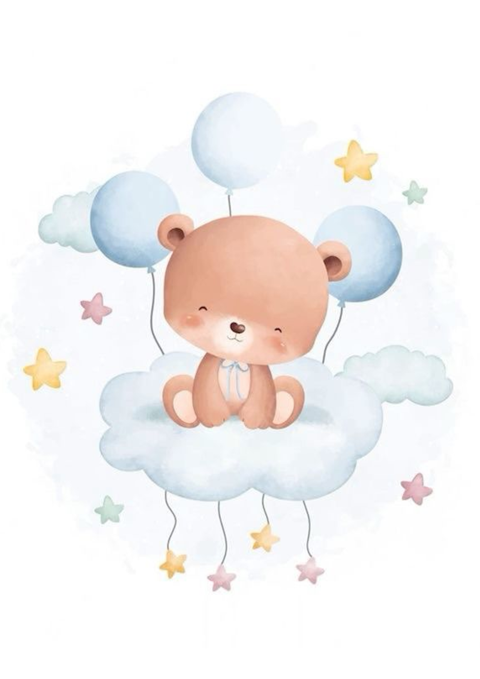 Tierna ilustración de un dulce osito descansando suavemente sobre una esponjosa nube, acompañado de delicados globos azules que parecen flotar en el cielo. Rodeado de pequeñas estrellas en tonos pastel, el diseño transmite tranquilidad, dulzura y un ambiente soñador lleno de calma.