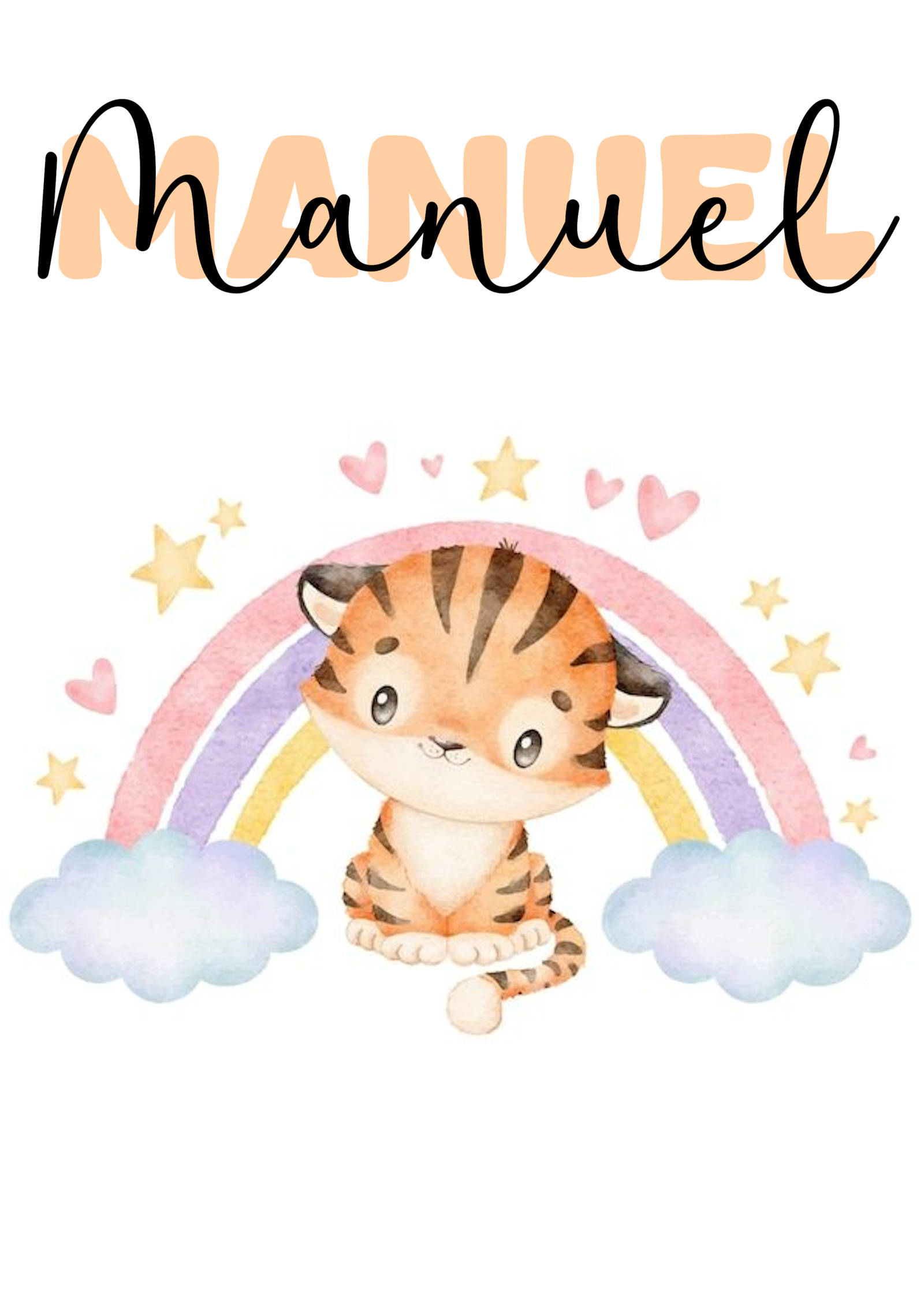 Preciosa lámina infantil con un dulce tigrito sentado bajo un suave arcoíris en tonos pastel, rodeado de pequeñas estrellas y corazones que transmiten ternura y alegría. Su diseño delicado y armonioso crea un ambiente cálido, dulce y acogedor en cualquier habitación infantil. Personalizable con el nombre, se convierte en un recuerdo único y especial, ideal como regalo de nacimiento, bautizo o cumpleaños. Perfecta para añadir un toque tierno, mágico y lleno de amor a la decoración de bebés y niños.