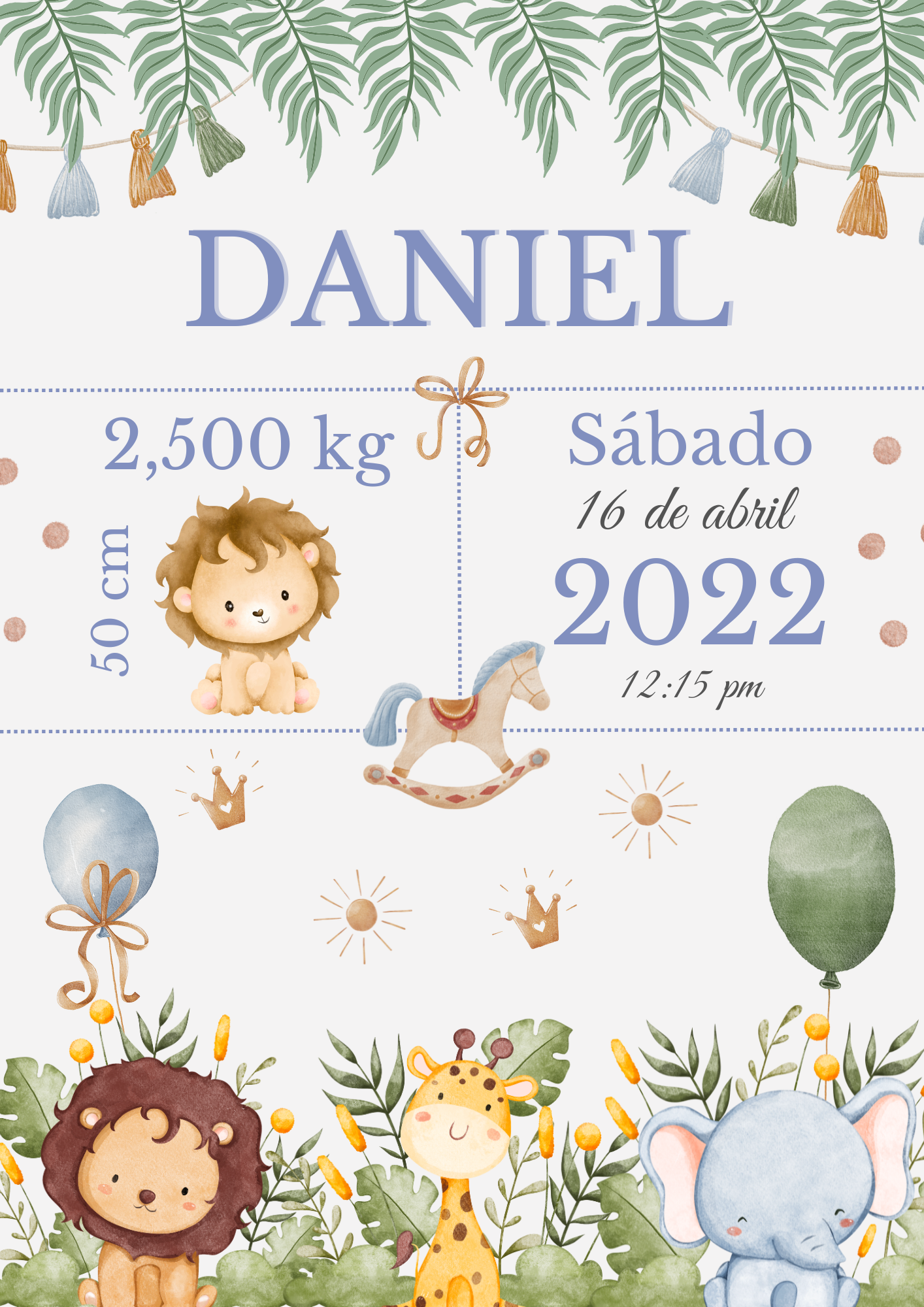 Tierna lámina natalicia personalizada con encantadores animalitos de la selva en estilo acuarela: león, jirafa y elefante, acompañados de detalles suaves en tonos azul, verde y tierra. Un diseño dulce, equilibrado y natural que guarda para siempre los datos más importantes del nacimiento del bebé.