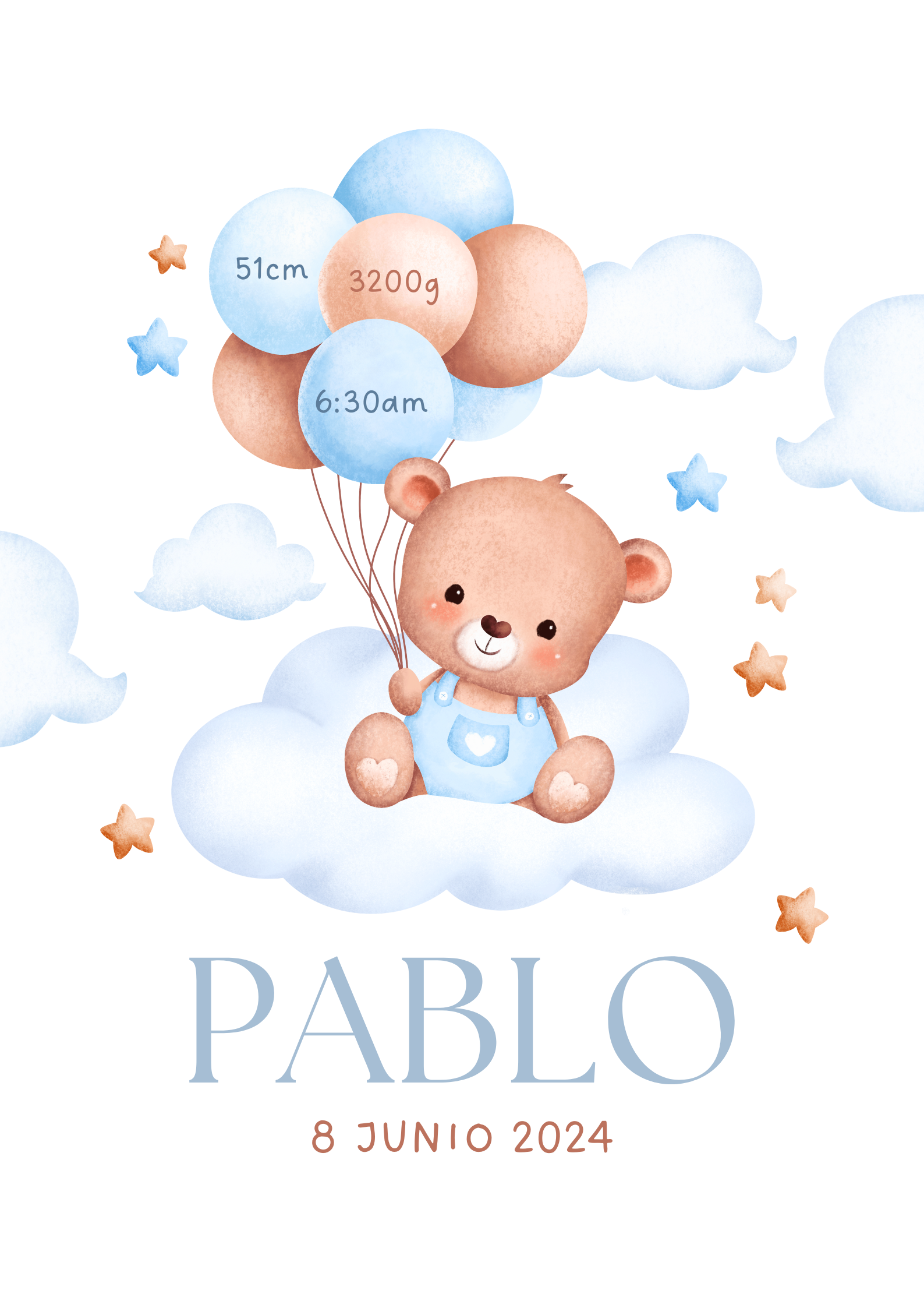 Tierna lámina natalicia personalizada con un dulce osito sentado sobre una nube, sosteniendo globos en suaves tonos azul, beige y melocotón. Un diseño delicado y encantador que guarda para siempre los datos más importantes del nacimiento del bebé.