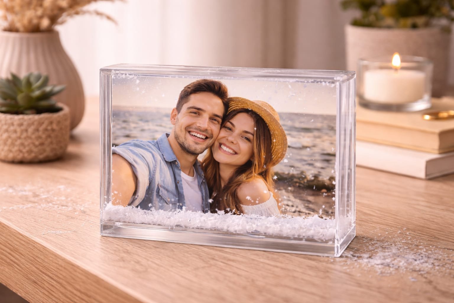 • Portafotos rectangulares de plástico transparente, rellenos de agua